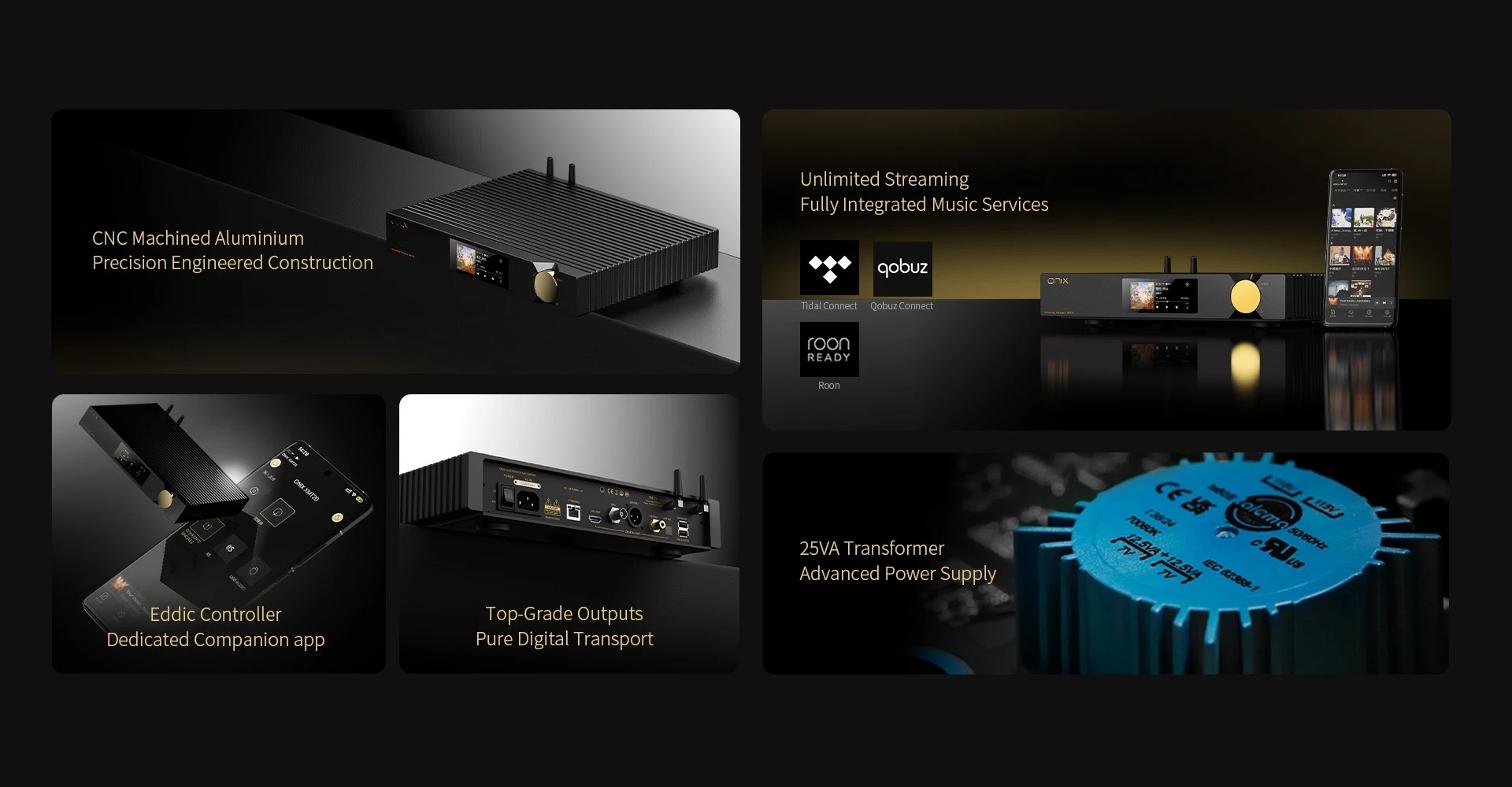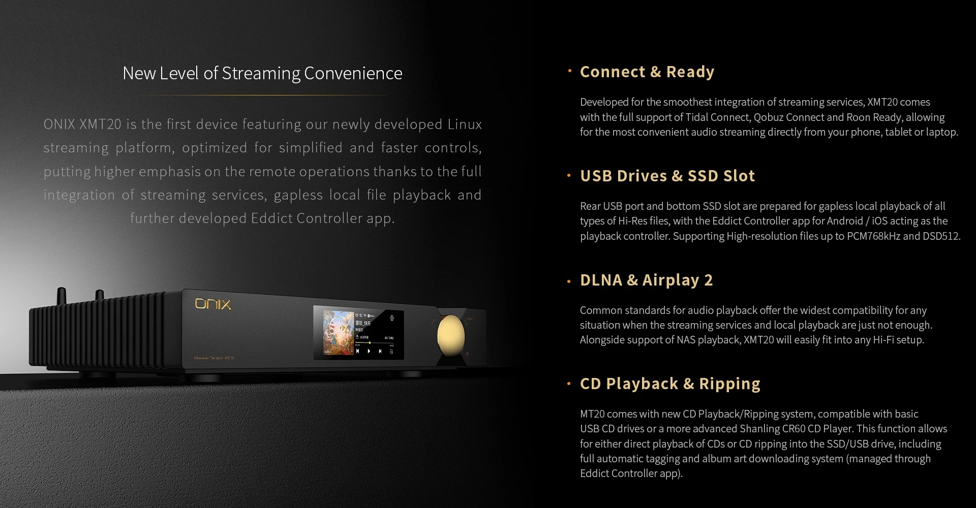 ONIX - Zenith XMT20 Flagship Streamer Transport | M.2, USB input | Optical, Coaxial (RCA,BNC), AES, I2S, USB out | ROON Ready, Qobuz, Tidal Connect | Eddict App | WiFi, RJ45 | DLNA, Airplay2, NAS