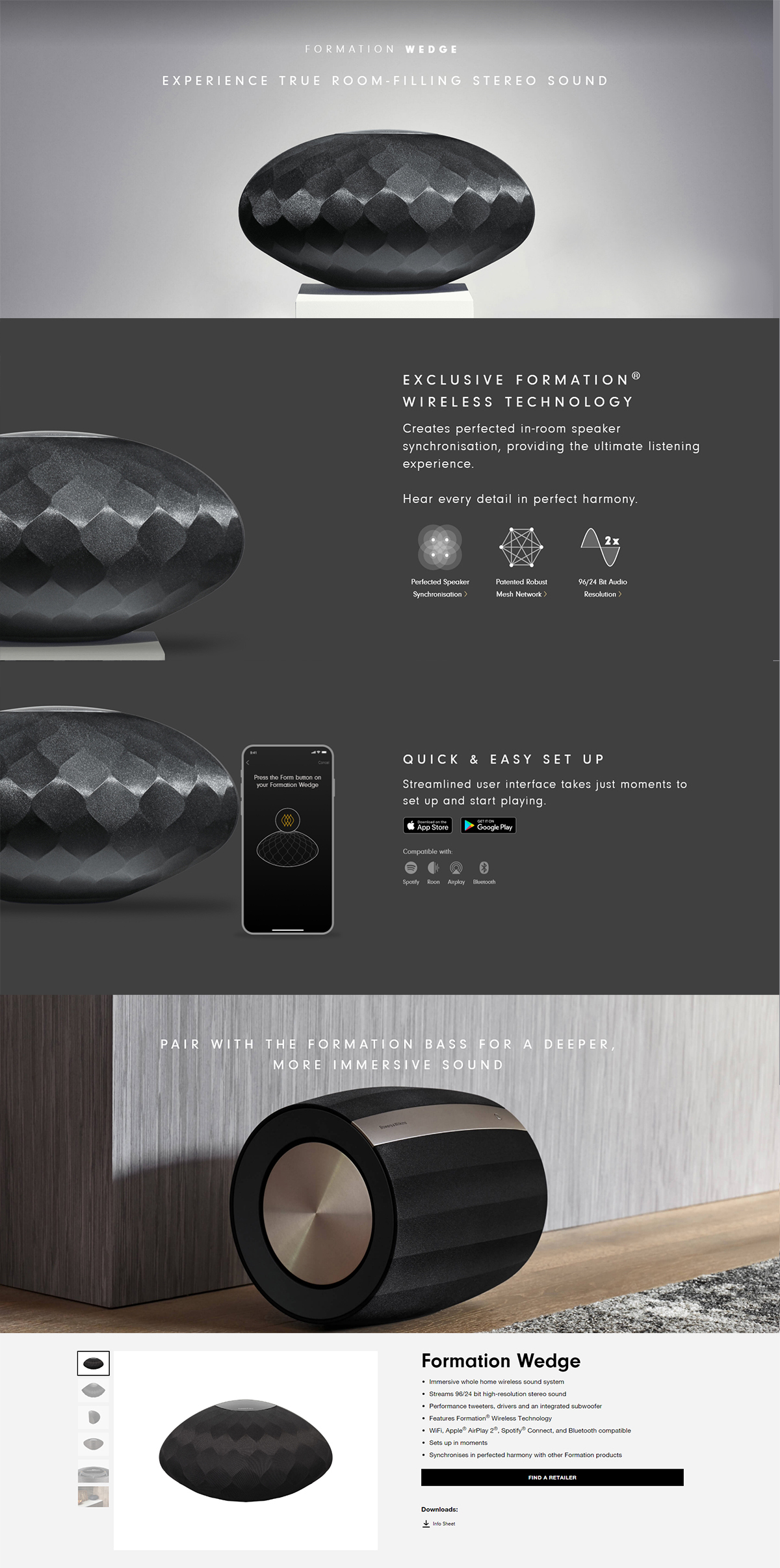 為您創造完全沉浸在極致音樂享受的家庭無線音響系統。96/24 bit高解析無限串流立體聲效。五顆高效能單體,包含二顆高音、二顆中音與一顆超低音。搭配獨家設計Formation®無線科技。WiFi, Apple® Airplay 2®, Spotify®連線;亦可搭配Roon或藍牙使用。